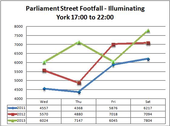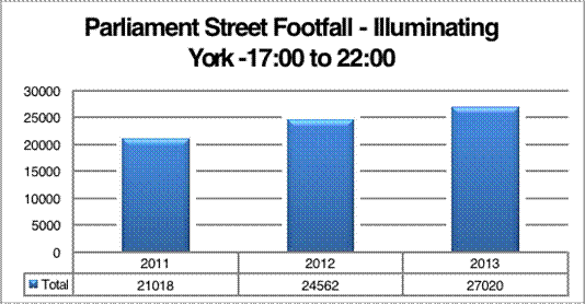 However, we do have the footfall camera in Parliament Street and these are supplied below. I must emphasise that these are not the figures for the entire festival as the routes through the city from event to event will differ. But in comparison to previous years you can see that the single camera capture figures are significantly up for 2013 compared to previous years.”