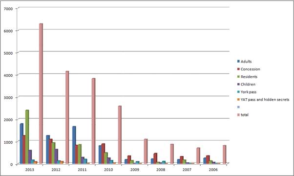 Attendance is recorded by categories or entrance charge. The bands are Adults, Concessions, Residents, Children, York Pass and York Archaeological Trust Pass.